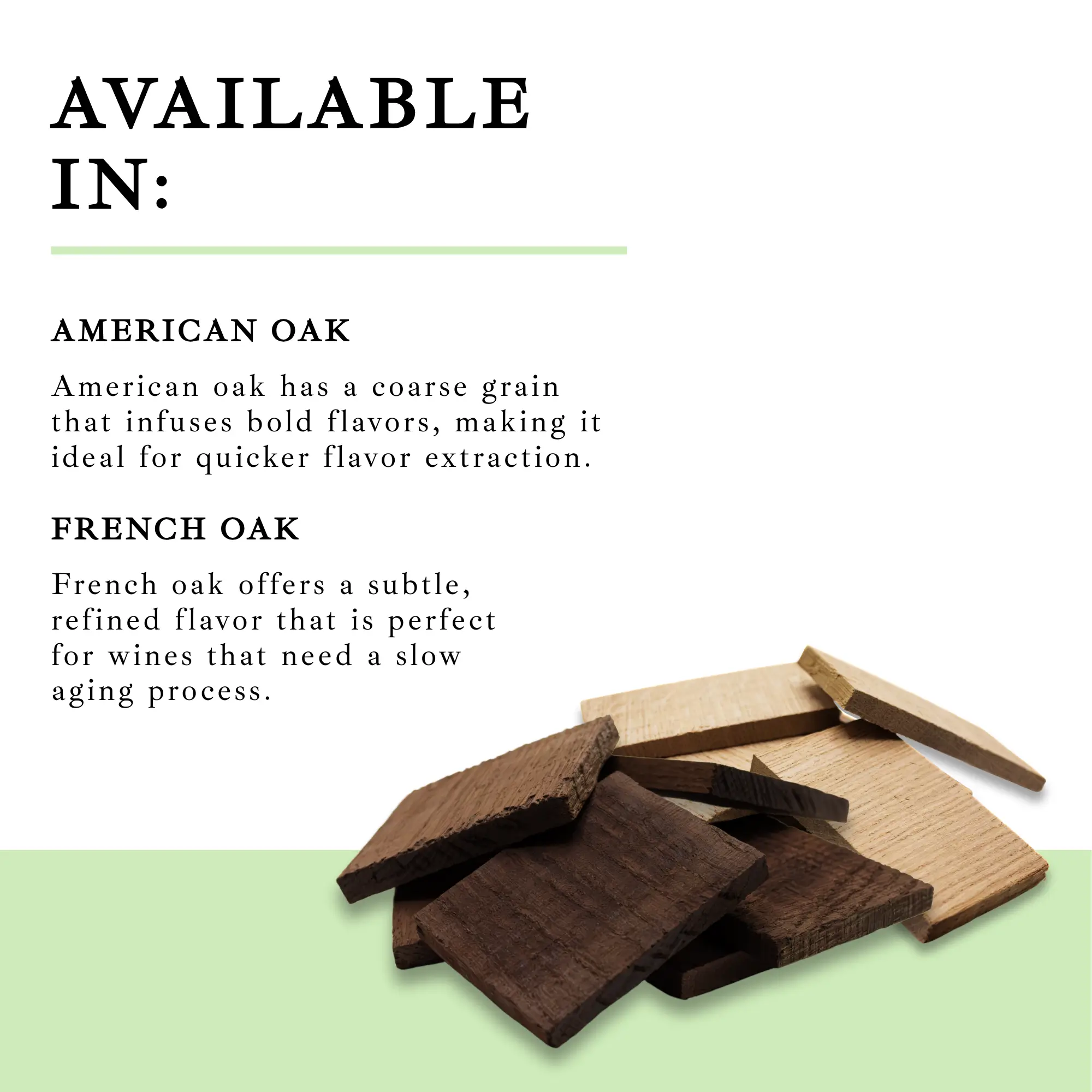 - Available in French (Quercus Robur) and American Oak (Quercus Alba).
