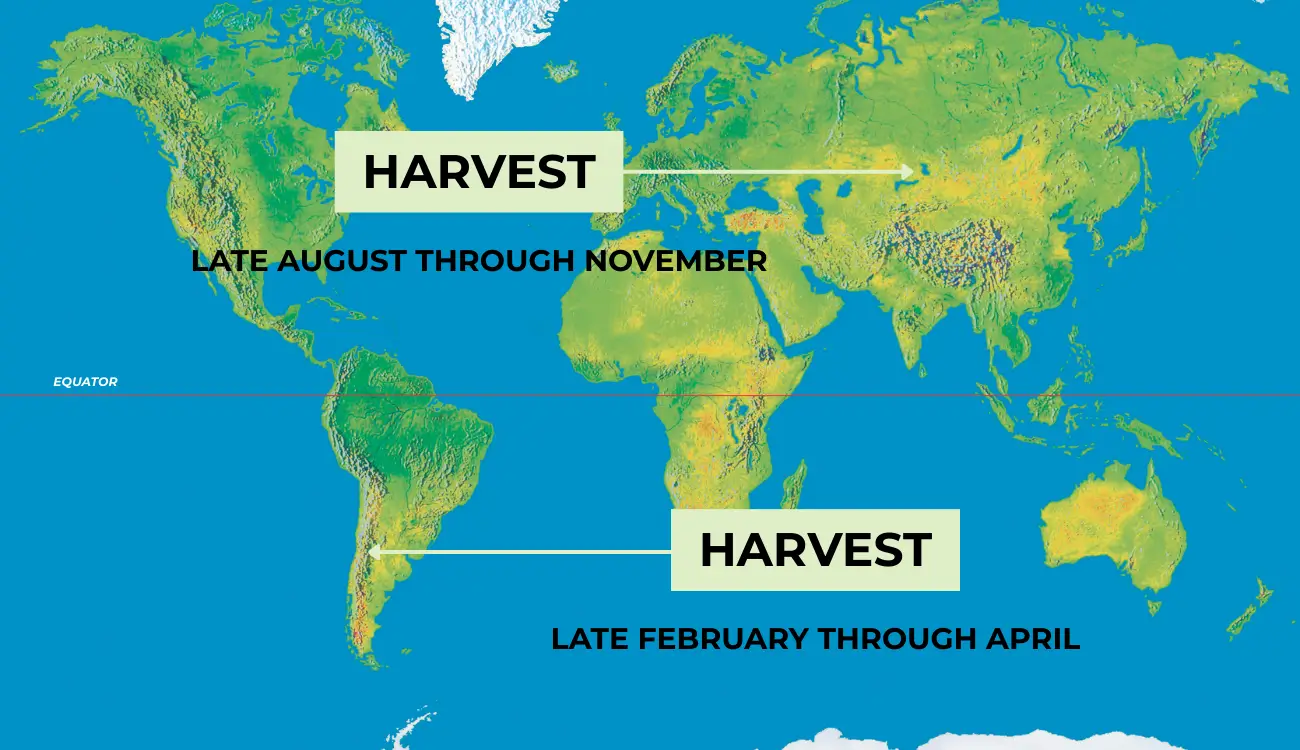 Harvest, in it’s simplest form, refers to the process of picking grapes at their peak ripeness for winemaking. In the Northern Hemisphere, harvest typically occurs from late August through November, while in the Southern Hemisphere it usually spans from late February through April. However, exact timing depends on a region’s climate, soil composition, grape varietal, and vineyard management practices.